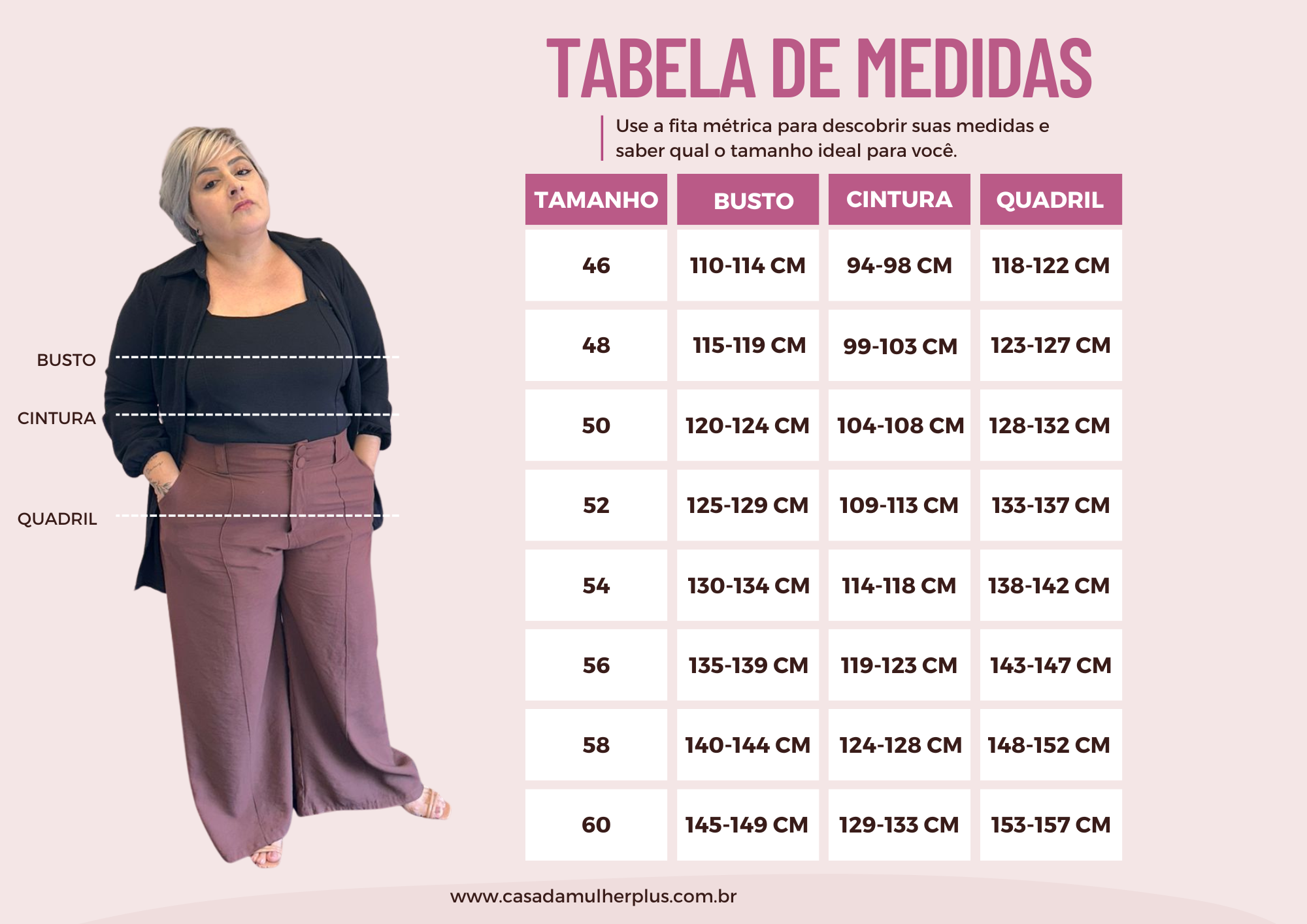 Modelagem Inclusiva: Veste do tamanho único 46 ao 52, ideal para diversas silhuetas.